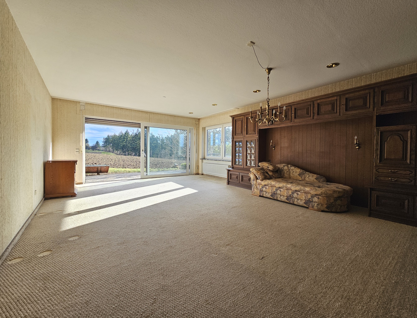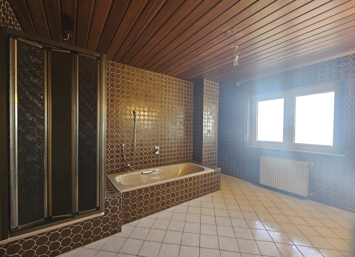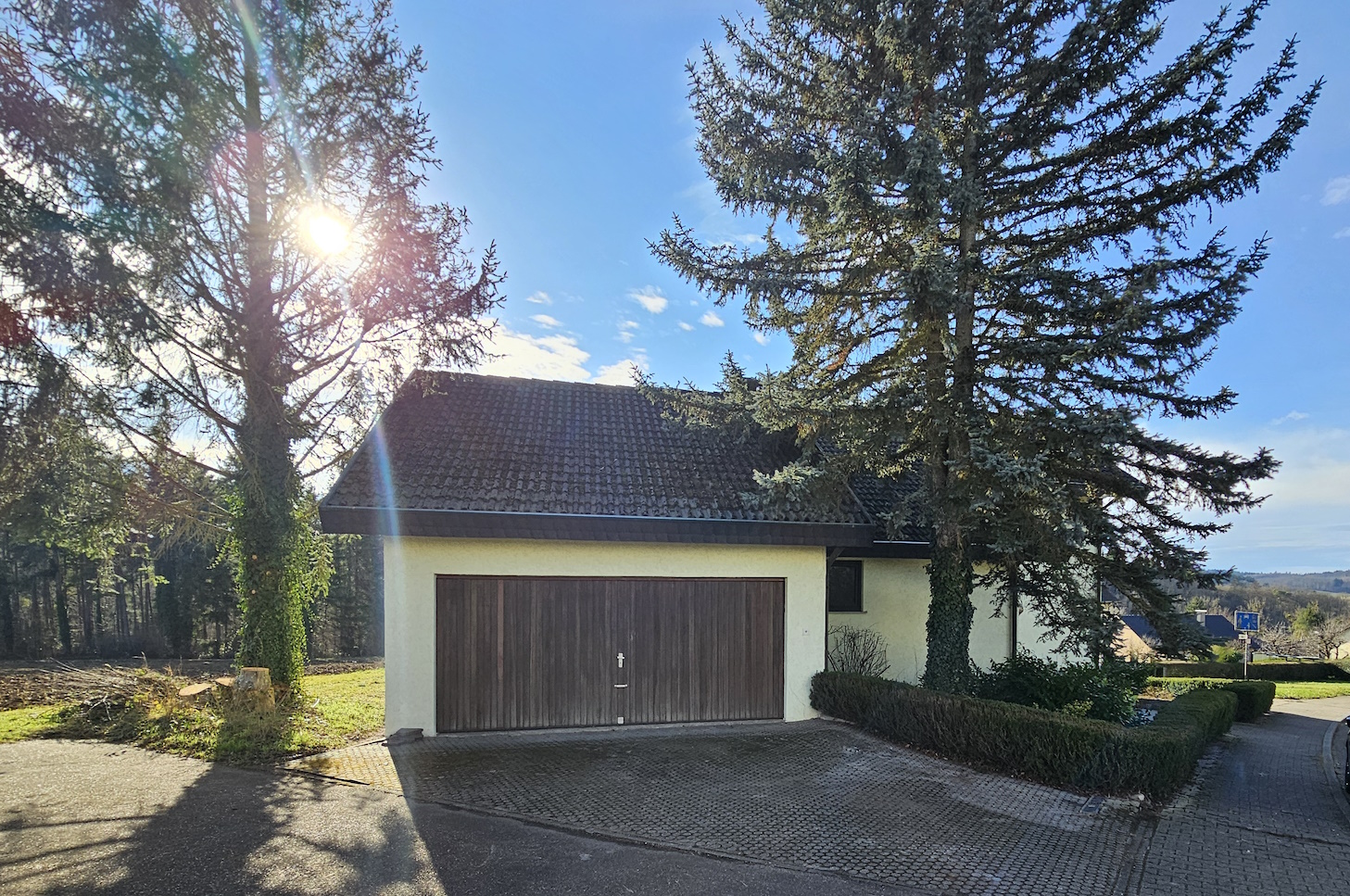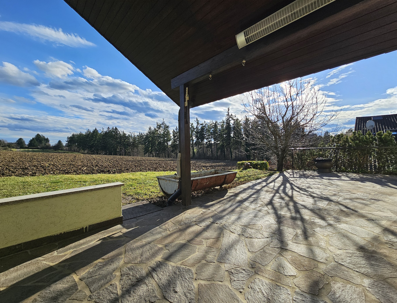 Solide Massivbauweise. Gute Substanz. 202 m² Wohnfläche im Erd- und Dachgeschoß; ca. 60 m² im Souterrain (zuletzt als Praxis genutzt). Terrasse im Erdgeschoß mit unverbautem Blick auf Wiesen und Felder. Loggia im Dachgeschoß mit Panoramablick. Praxis / Büroräume im Souterrain mit separatem Zugang. Doppelgarage mit Zugang zum Haus.