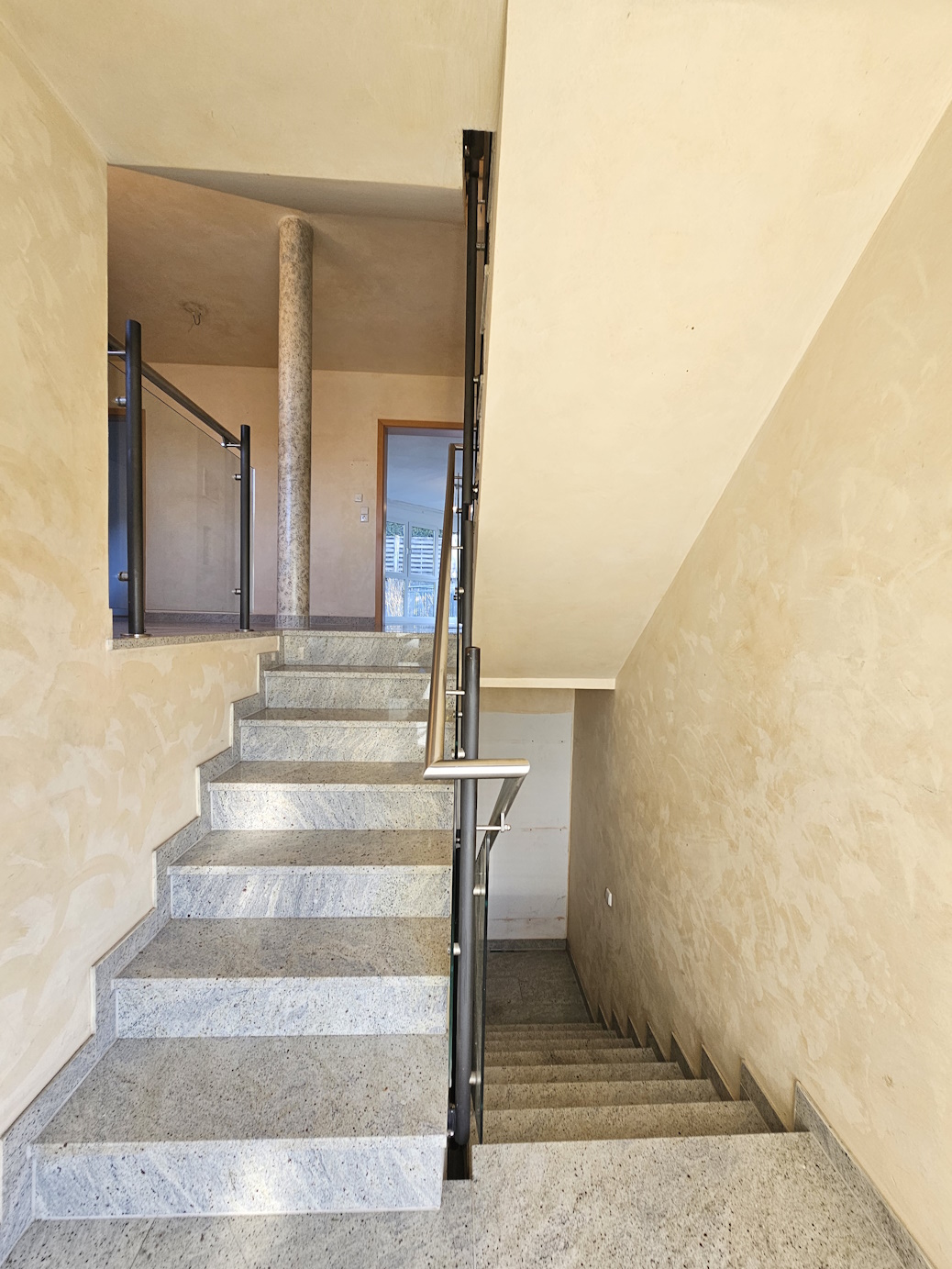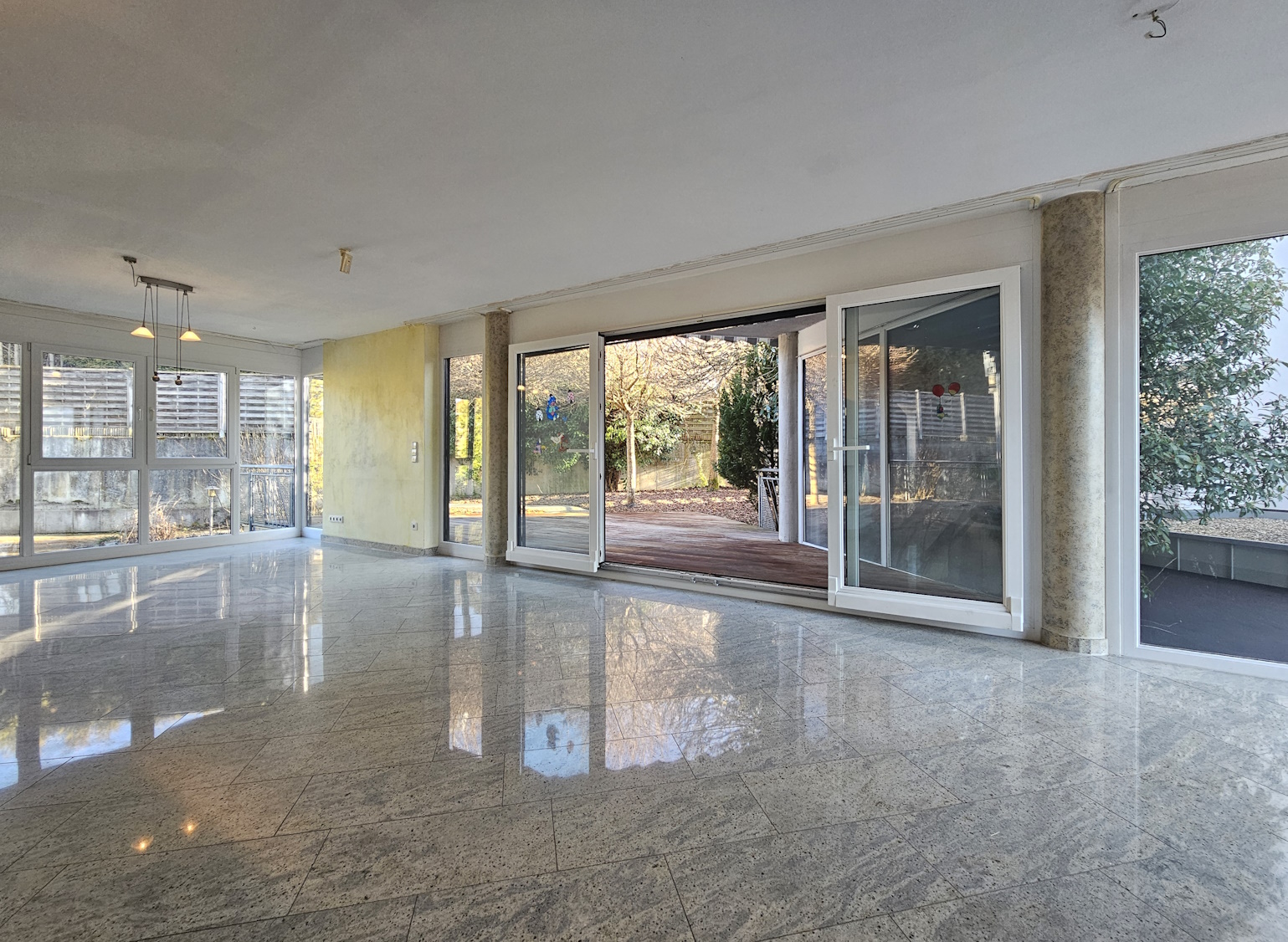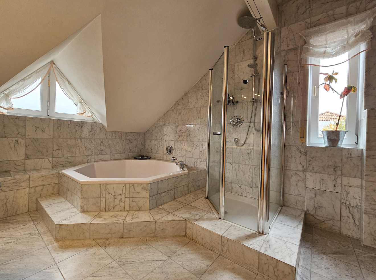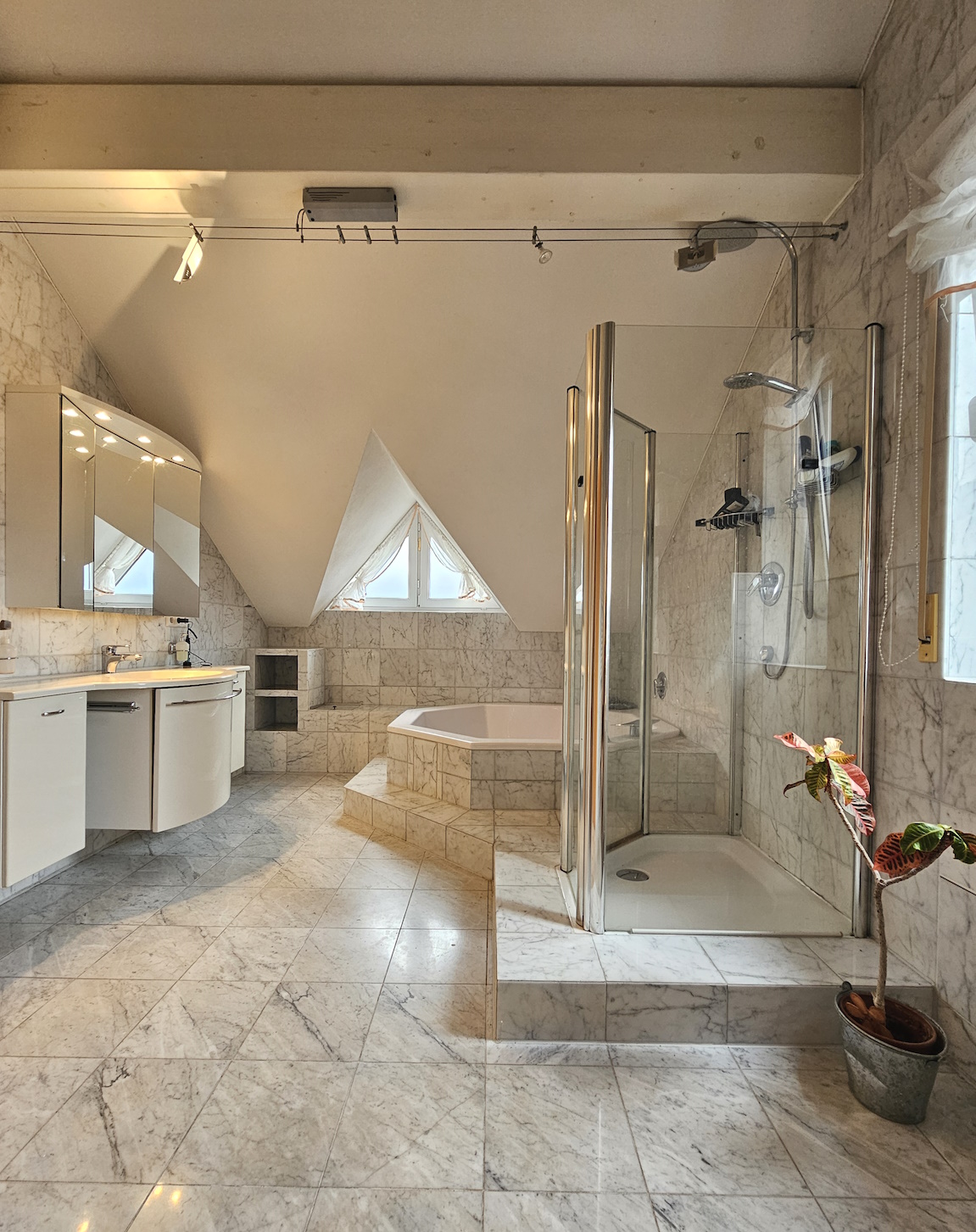In solider Massivbauweise errichtetes, geräumiges Architektenhaus mit gehobener Ausstattung. 217 m² Wohnfläche im Souterrain, Erd- und Dachgeschoss des Hauses sowie 52 m² Wohnfläche in der Einliegerwohnung (Rohbau) im Souterrain. Wellnessbereich mit Sauna und Whirlpool im Souterrain, große Doppelgarage mit Zugang ins Haus und in den Garten. 50 m² Wohn- und Essbereich mit Panoramaverglasung und ebenerdigem Zugang zur Terrasse und den blickgeschützten Garten mit Außenpool. Elternschlafzimmer mit Ankleidezimmer (Badezimmer en Suite) sowie zwei gut dimensionierte Kinderzimmer im Dachgeschoss.