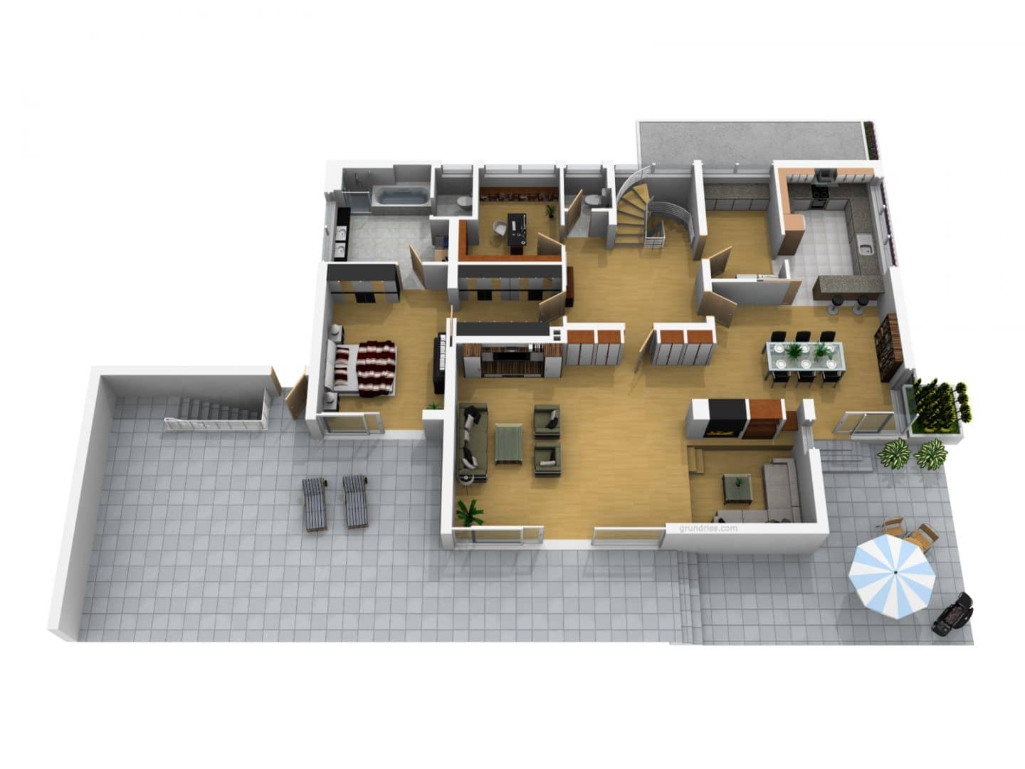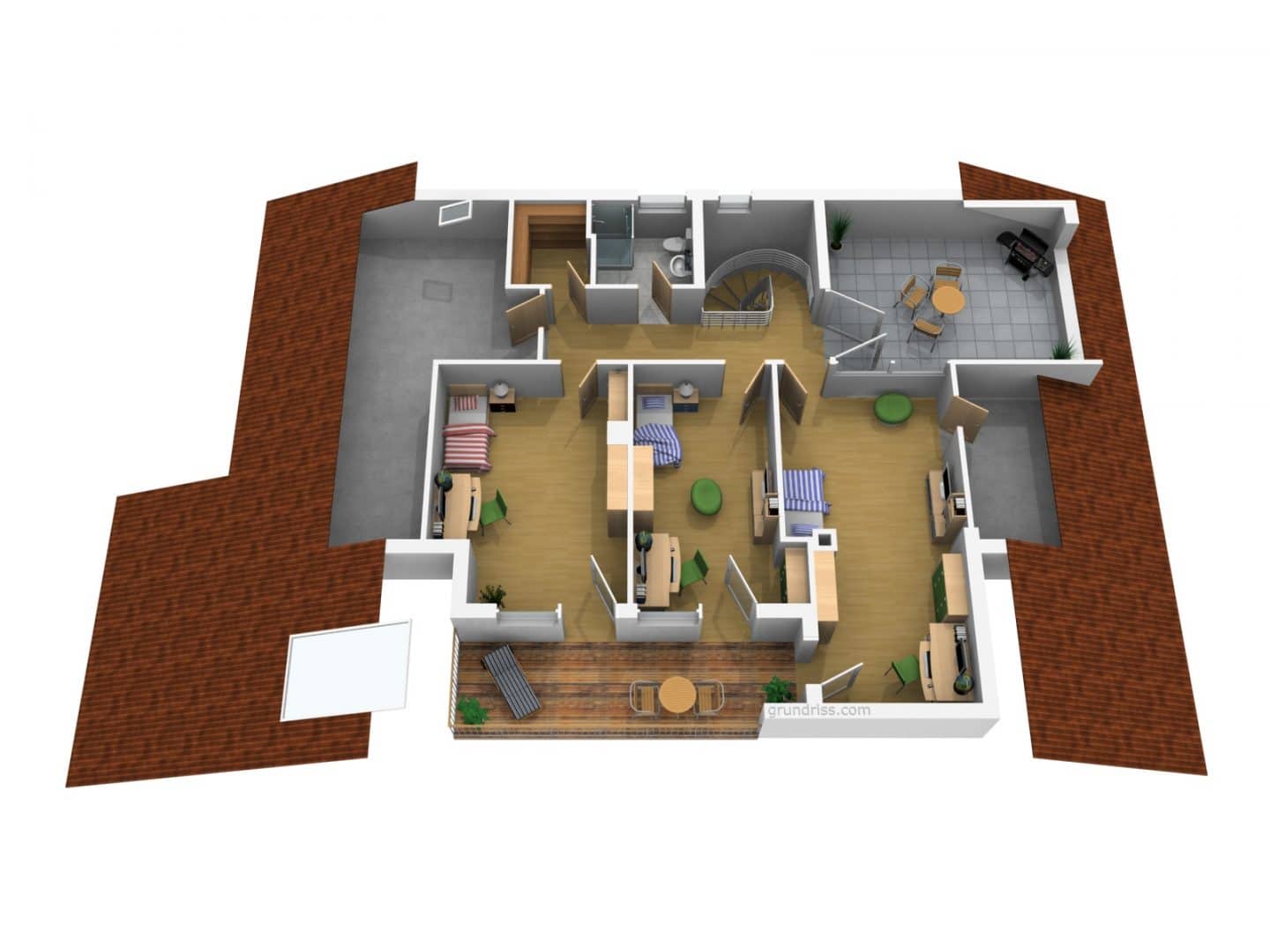 Großzügig geschnittene, gut belichtete Wohn- und Schlafräume mit größtenteils ebenerdigem Zugang zu den Terrassen im Erdgeschoss bzw. auf die Dachterrasse und die Loggia im Dachgeschoss bieten einen hohen Komfort.