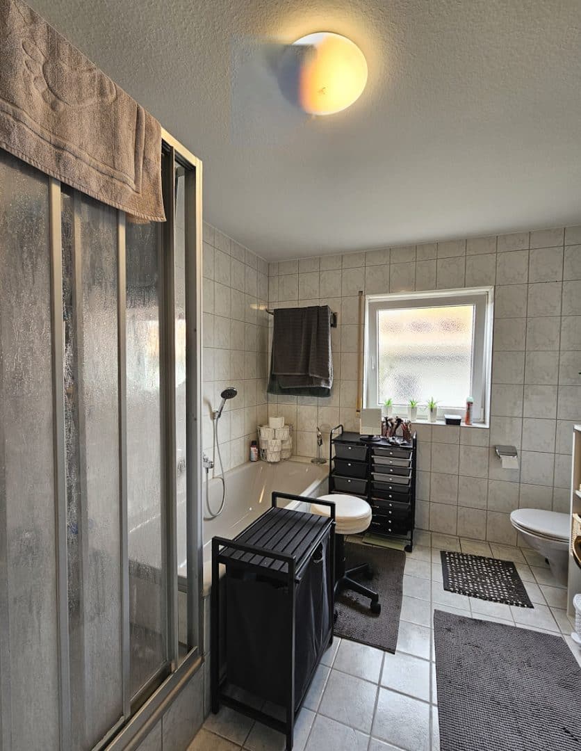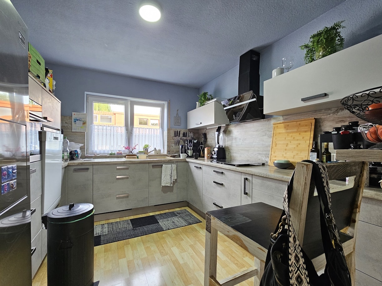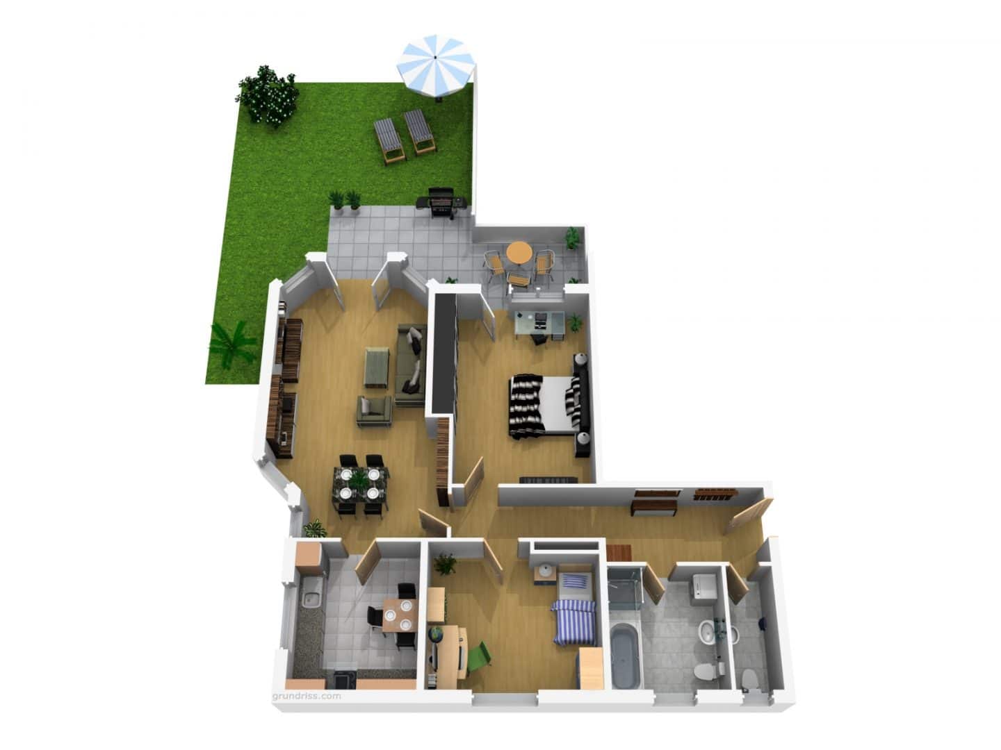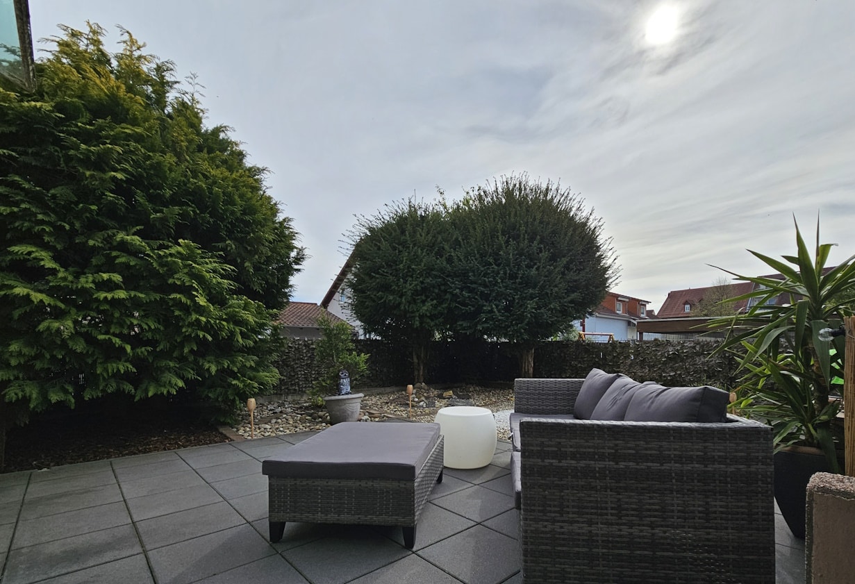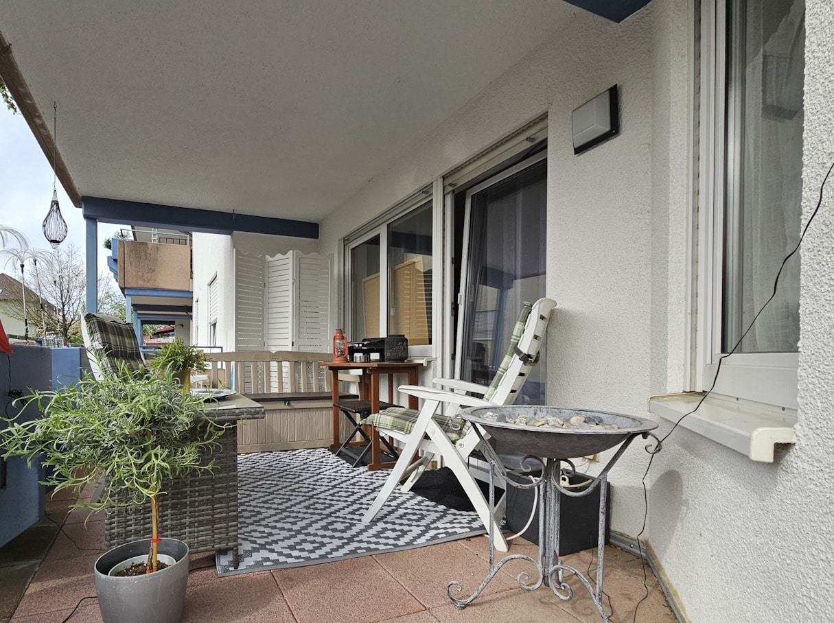 Die Wohnung befindet sich im Hochparterre eines Mehrfamilienhauses mit insgesamt neun Eigentumswohnungen. Die Wohnfläche von ca. 103 m² verteilt sich auf drei helle Zimmer, eine separate Küche, das Tageslichtbad mit WC und ein Gäste-WC, ebenfalls mit Tageslichtfenster. Vom Wohnzimmer und dem größeren der beiden Schlafzimmer gelangt man auf den Balkon bzw. auf die Terasse sowie den zur Wohnung gehörenden Gartenanteil. Im Kaufpreis enthalten ist eine Garage im Untergeschoss des Hauses sowie ein großer Kellerraum.