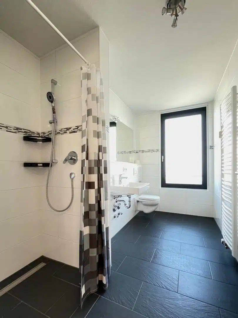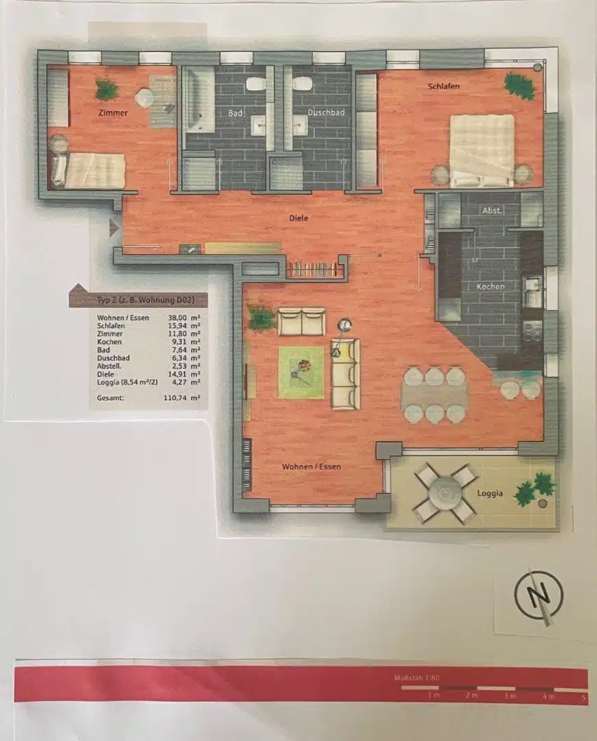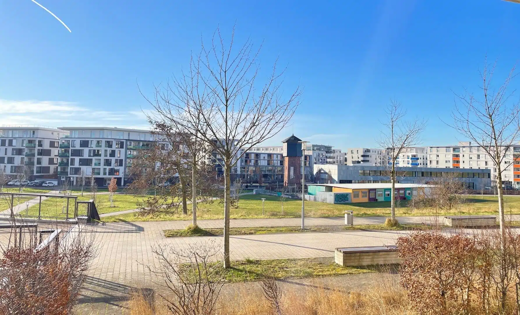 Diese Wohnung befindet sich im 2. Obergeschoss eines im Jahr 2014 fertig gestellten und hochwertig ausgestatteten Hauses mit insgesamt 32 Wohnungen. Die Wohnung empfängt Sie mit einer geräumigen Diele, von hier aus gelangt man auf der linken Seite zu den 2 Schlafräumen und 2 getrennten Tageslichtbädern. Der Lebensmittelpunkt der Wohnung ist der Parkseite zugewandt. Die großzügige Fläche mit ca. 47 m² verteilt sich auf den offen gestalteten Wohn- Ess- und Kochbereich. Im Anschluss der Küche verbirgt sich ein kleiner begehbarer Abstellraum. Vom Wohn- und Esszimmer gibt es jeweils einen Zugang zur Loggia, von hier aus genießt man einen herrlichen Blick auf den schön angelegten Citypark. Zur Wohnung gehören ein Kellerraum im Untergeschoss sowie ein TG-Stellplatz. Zur gemeinschaftlichen Nutzung stehen Waschmaschinenräume und Fahrradkeller zur Verfügung.